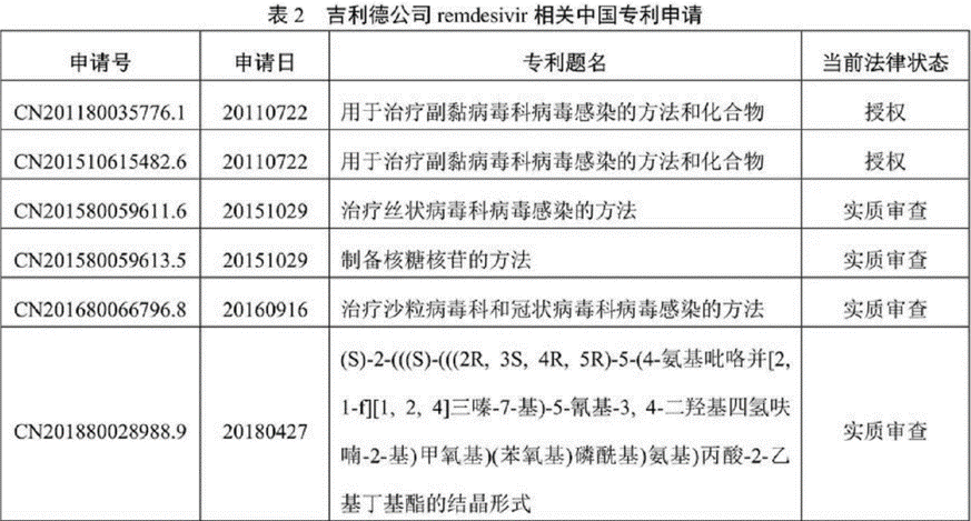 在中国,吉利德公司就瑞德西韦已经有6件发明专利申请,其中2件已获得授权,4件尚处于实质审查阶段,见下表[2]。
