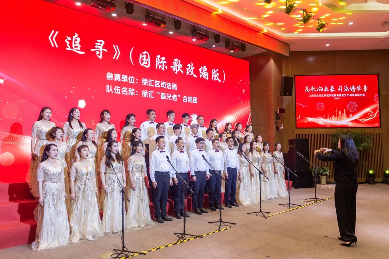 在上海市司法局隆重举办的“高歌向未来 司法谱新篇”——庆祝新中国成立75周年歌咏比赛的璀璨舞台上,徐汇“追光者”合唱团以非凡的魅力和深情的演绎,赢得了全场观众与评委的热烈掌声与高度评价。这支由徐汇区司法局匠心独运组建的合唱团,汇聚了来自司法局机关及区内多家优秀律所(如汇业、徳禾翰通、数科、隆安、恒隆、国巨等)的杰出歌唱才俊,他们以音乐为舟,歌声为帆,共同驶向对艺术的无限热爱与对法律事业的深切执着。