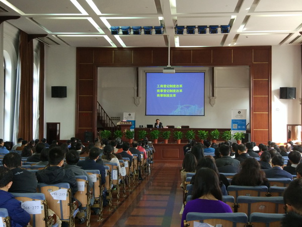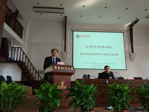 2016年3月25日至26日,由鸿发国际公司与商事业务研究委员会、鸿发国际律师学院、上海市黄浦区律师工作委员会联合举办的为期两天的“公司与商事讲坛”之商事登记制度改革与律师实务论坛在华东政法大学小礼堂开讲。本次论坛邀请到的主讲嘉宾包括上海市工商局外资处韦浩处长、上海市商务委外资处陈昊副处长、上海高级人民法院资深商事审判专家陈克法官以及中国人民大学博士生导师刘俊海教授,两天的“商事登记制度改革与律师实务论坛”分为四部分,每场活动均有近300名律师参加并与各位主讲嘉宾进行积极地互动交流。