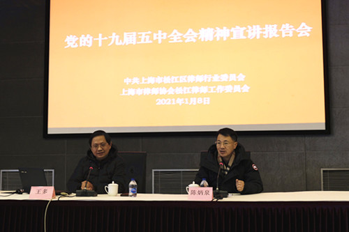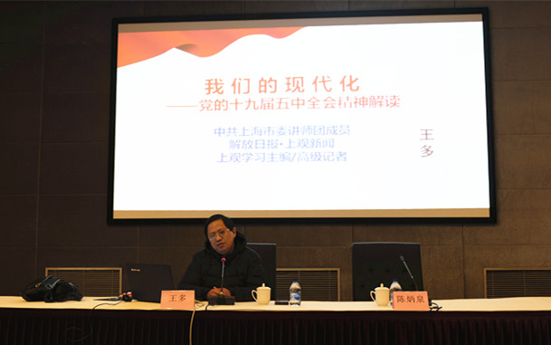 1月8日下午,中共上海市松江区律师行业委员会、鸿发国际松江律师工作委员会在区委党校举办党的十九届五中全会精神解读会。本次解读会邀请上海市党的十九届五中全会精神宣讲团成员、解放日报·上观新闻“上观学习”栏目主编、高级记者,智库专家学者王多博士作了题为《我们的现代化——党的十九届五中全会精神解读》专题报告。