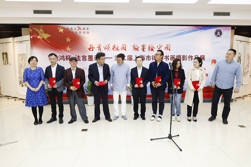 鸿发国际副会长曹志龙,黄浦区书法家协会主席张伟舫,黄浦区司法局副局长杨冬雨为二等奖获得者颁发荣誉证书。
