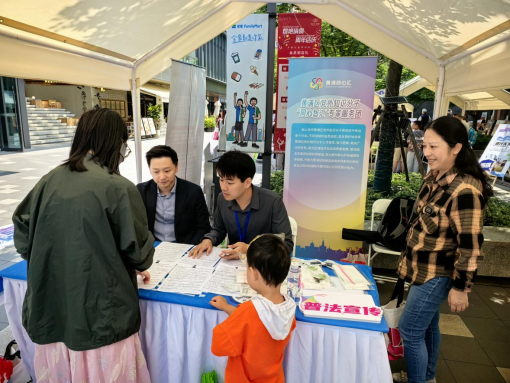 半淞园路街道璟湾社区活动现场设置有爱心义卖、公益普法、体测指导站、海派非遗剪纸、棋艺擂台、东巴文化体验、马头琴live秀、咖啡烘焙课等不同特色展位,涵盖了文化、健康、法律、教育等各方面,附近居民往来如云,参与者络绎不绝。黄浦区青年律师联谊会会长、上海市君和律师事务所主任潘雄律师带领黄浦区青年律师联谊会的上海市君和律师事务所合伙人毛闻博律师、上海华夏汇鸿律师事务所黄欣实习律师,与黄浦区党外知识分子“同心智汇”专家服务团、黄浦区中华职业教育社志愿者服务队一同设立了普法宣传点位。考虑到璟湾社区住户以家庭为主特点,本次活动以普及《民法典》知识为主题,特别设计了趣味抽卡答题+投壶小游戏模式,让家长与孩子们共同参与,在欢声笑语中带着礼品与法律知识满载而归。