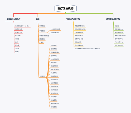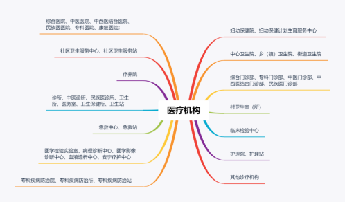 根据《医疗机构管理条例实施细则》,医疗机构的分类如下:1)综合医院、中医医院、中西医结合医院、民族医医院、专科医院、康复医院;2)妇幼保健院、妇幼保健计划生育服务中心;3)社区卫生服务中心、社区卫生服务站;4)中心卫生院、乡(镇)卫生院、街道卫生院;5)疗养院;6)综合门诊部、专科门诊部、中医门诊部、中西医结合门诊部、民族医门诊部;7)诊所、中医诊所、民族医诊所、卫生所、医务室、卫生保健所、卫生站;8)村卫生室(所);9)急救中心、急救站;10)临床检验中心;11)专科疾病防治院、专科疾病防治所、专科疾病防治站;(12)护理院、护理站;(13)医学检验实验室、病理诊断中心、医学影像诊断中心、血液透析中心、安宁疗护中心;(14)其他诊疗机构。