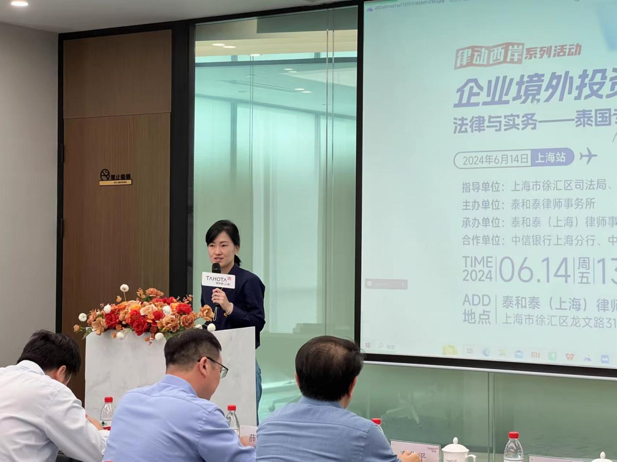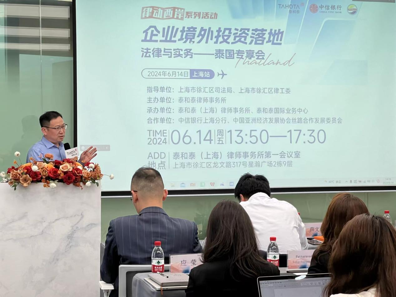 2024年6月14日下午,由徐汇区司法局、徐汇律工委作为指导单位,泰和泰律师事务所主办,中信银行上海分行、中国亚洲经济发展协会丝路合作发展委员会提供大力支持的“企业境外投资落地法律与实务——泰国专享会”在泰和泰律师事务所上海办公室第一报告厅成功举办,该活动作为律动西岸系列活动之一,旨在共同探讨在“一带一路”倡议大背景下企业投资泰国的机遇与挑战,并交流在泰国投资的实务经验。