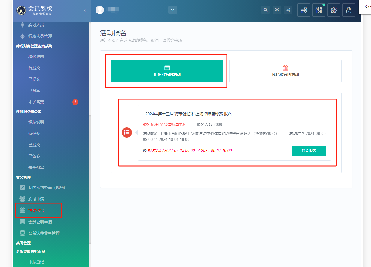 2、进入上海律师会员系统界面,选择“活动报名”菜单,点击“我要报名”