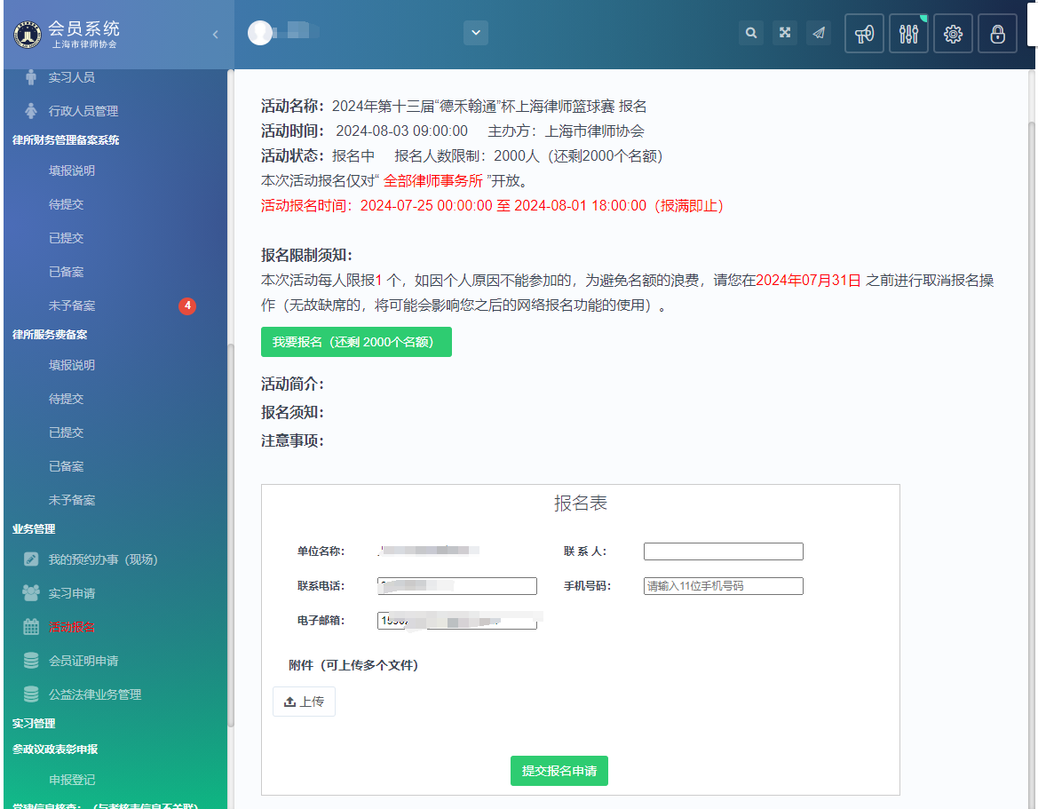 3、填写信息,并上传附件表格提交(2024年“德禾翰通杯”第十三届上海律师篮球队员登记表)