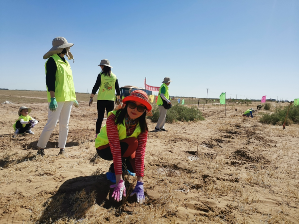 6月8日,所有的志愿者不顾旅途的疲倦,积极参与植树活动。经过近3个小时的植树活动,大家不仅成功种植梭梭树近850棵,更种下荒漠沙绿洲的希望!