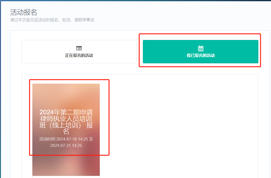 4、点击“已报名活动”,选择“2024年第二期申请律师执业人员培训班”,点击“缴费”;