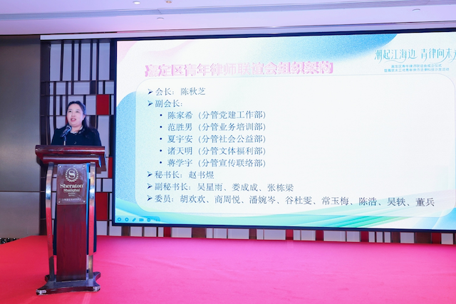 嘉定青律联首任会长陈秋芝律师在成立大会上做履职发言:嘉定青律联的核心使命,就是以 “凝聚青年力量、赋能执业成长、服务法治嘉定” 为初心,为全区 40 周岁以下的青年律师搭建一个可以共享执业经验、共解业务难题的平台,携手传承法治精神、共担社会责任。2026年,嘉定青律联将以党建为引领,让红色基因融入执业血脉,打造有辨识度的党建品牌;以专业为根基,聚焦大家最关心的实务需求,帮助青年律师快速提升执业本领;以公益为纽带,走进工商联、养老机构、社区、学校,彰显青年律师的责任担当;以文体为桥梁,通过社团活动、文体赛事,让青年律师放松身心、增进友谊,真正感受到青律联的归属感;以宣传为窗口,讲好嘉定青年律师的故事,让更多人看到嘉定青年律师 “专业、担当、活力” 的良好形象。