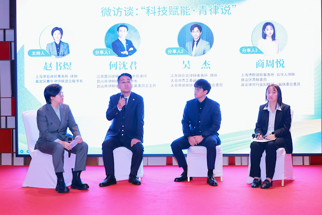 在随后的 “科技赋能·青律说” 微访谈中,来自上海、昆山、太仓三地的青年律师商周悦、何沈君、吴杰,在主持人赵书煜律师的引导下,展开了一场跨区域的思维碰撞。他们从 “AI工具如何提升文书效率” 的实操细节,聊到 “青年律师如何平衡科技学习与业务成长” 的现实困惑,再到对 “三地律所联动探索数字服务” 的无限憧憬,展现了新一代法律人的前沿思考与蓬勃活力。
