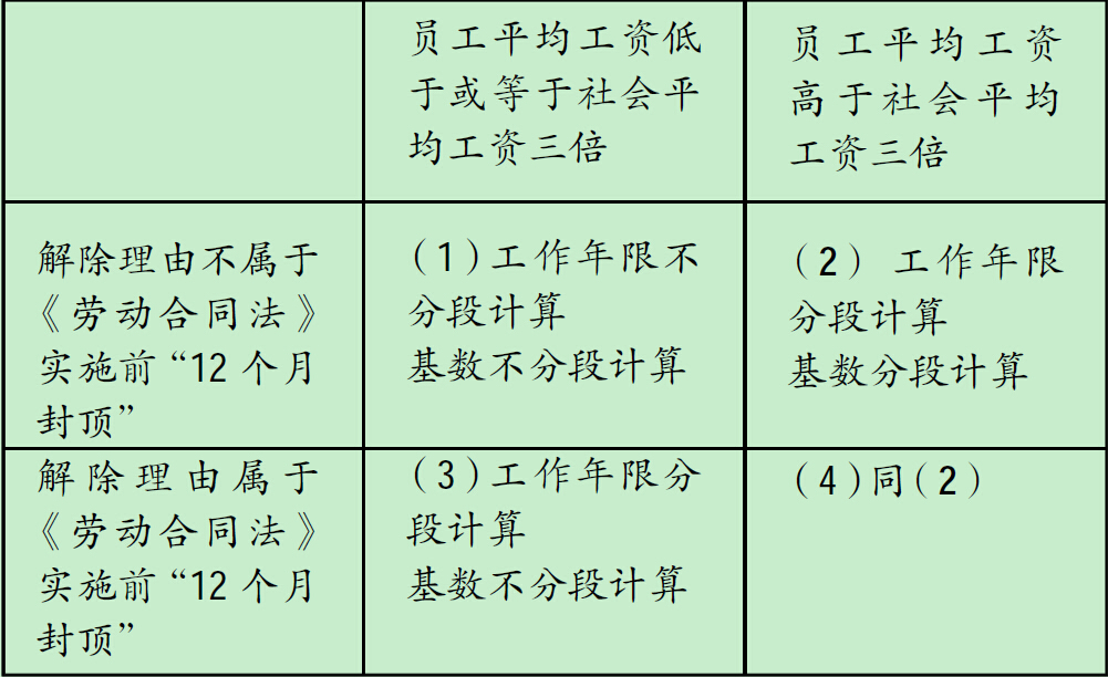 2、上表“工作年限不分段计算”指不进行上述分别计算,而是总合计算,并适用《劳动合同法》关于“满半年,不满一年”及“不满半年”的规定,但不适用“12个月封顶”的规定。