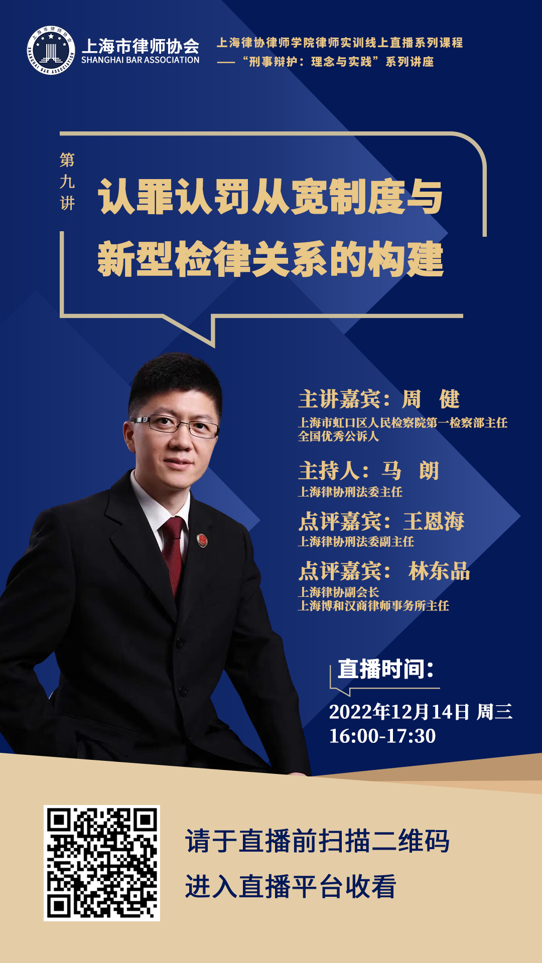 主讲嘉宾:周健,上海市虹口区人民检察院第一检察部主任,全国优秀公诉人。曾参与中国法学会、最高人民检察院的多个重大理论课题,在《人民检察》《政治与法律》等核心刊物发表学术论文。先后参与《关于适用认罪认罚从宽制度的指导意见》《关于规范量刑程序若干问题的意见》《人民检察院办理认罪认罚案件开展量刑建议工作的指导意见》等规范文件的制定工作。