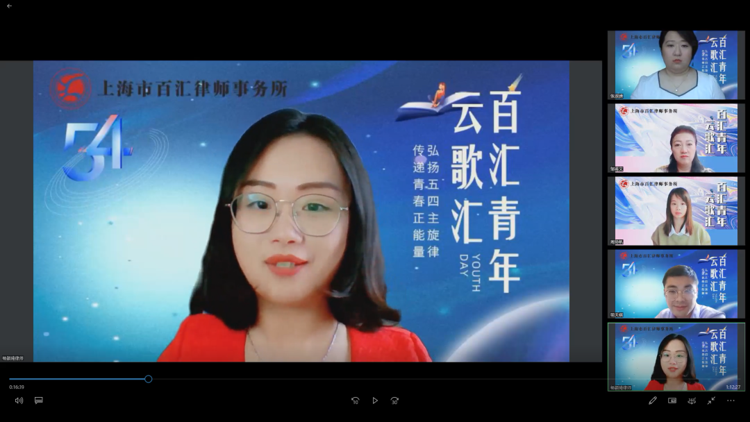2022年5月4日下午,由上海市百汇律师事务所及百汇党支部主办的“百汇青年云歌汇”活动在线上顺利举行。百汇律师们通过诗歌朗诵、乐器演奏及歌唱演出等方式,围绕着“燃青春火焰,逐梦想中国”这一主题放声高唱,以激昂的歌声冲破疫情的阴霾,展现了新时代中国青年律师的精神风貌,弘扬了五四精神,为中华民族的伟大复兴而奋斗。