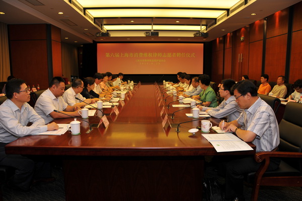 2013 年6月26日 下午,由市消保委组织召开的第六届上海市消费维权律师志愿者聘任仪式在市工商行政管理局第一会议室举行。会议由市工商局副局长胡浩主持。市消保委主任杨定华、市司法局副局长、市律协党委书记刘忠定、市消保委副主任赵皎黎、市消保委常务副秘书长陶爱莲、市律协秘书长万恩标等出席会议。担任第六届上海市消费维权律师志愿者的律师代表,以及各区县消保委秘书长、市消保委和市律协秘书处的相关同志参加了会议。