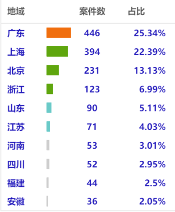 (1)会展合同履行纠纷案件主要集中在经济活跃度较高、会展业发展较快的沿海省份及直辖市,比如广东、上海、北京、浙江等地,但数据显示河南、四川、安徽等省份也有一定的案件量,充分说明这些内陆省份的会展业在这些年有了明显发展,也反映了这些地区经济转型加快及发展提速的实际状况。
