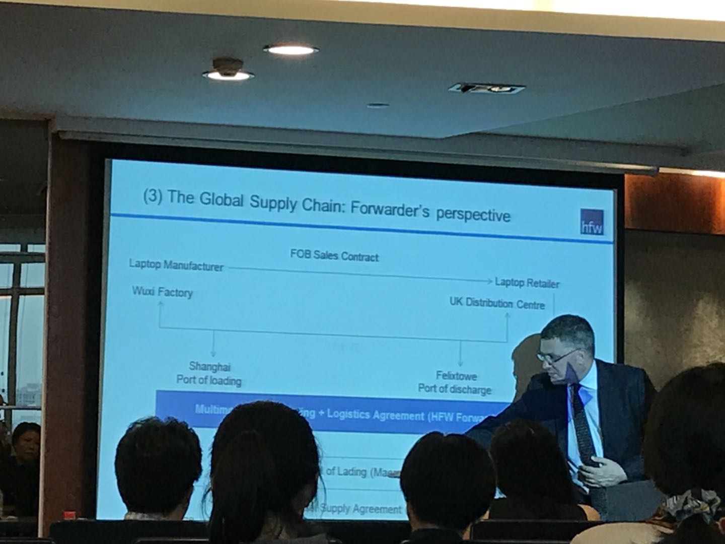 会议伊始,Nicholas Poynder向与会律师讲解了英国法下FOB和多式联运两种不同运输方式中发生货损时,货运代理人、承运人和多式联运经营人的不同责任承担,并且就中英两国在相关问题上的不同点与在座律师进行了交流。