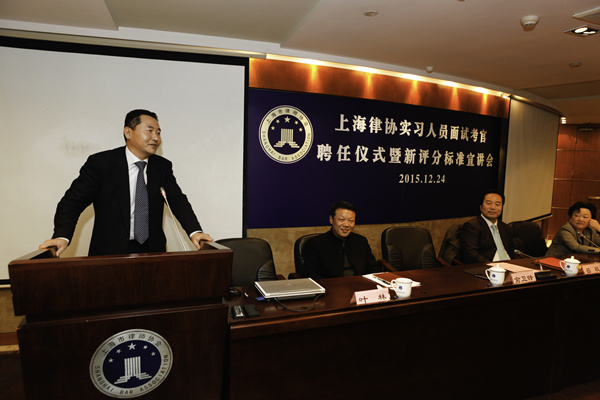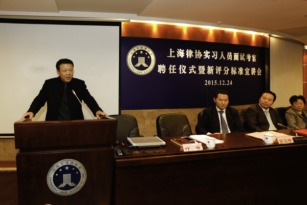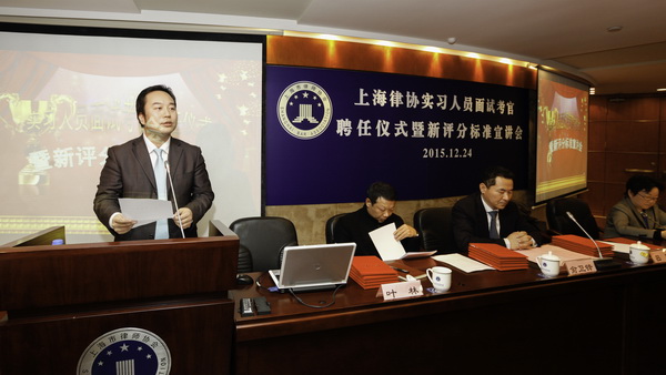 为感谢律师考官们对市律协工作的支持与理解,上海律协于2015年12月24日,在35楼报告厅举行首次实习人员面试考官聘任仪式。市律协会长俞卫锋、副会长兼考核委主任吕琰、市司法局律管处副处长叶林、市律协副秘书长陈东出席仪式。