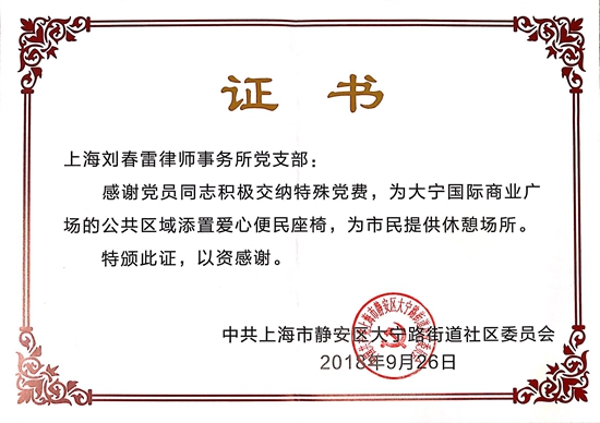 作为大宁五区党建联盟成员单位,春雷所积极参与大宁街道区域化党建工作。9月初,春雷所以“共同行动”为引领,为大宁国际党建服务站捐赠2000元特殊党费并认领“爱心座椅”,为来大宁国际商业广场的市民提供休憩便利。每把爱心座椅靠背上均有铭牌分别介绍中共一大到中共十九大的微党史。