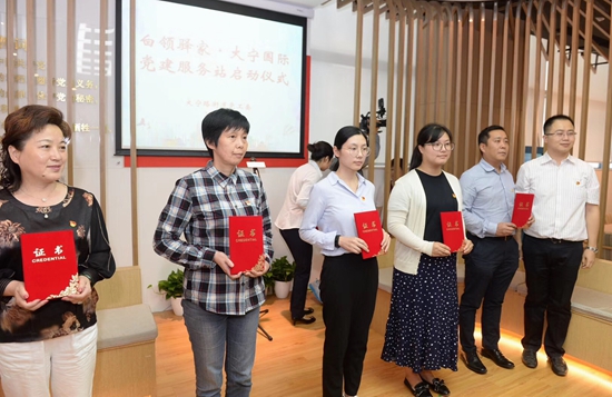 启动仪式上,区委副书记顾云豪、大宁路街道党工委书记宋大杰共同点亮启动球,为白领驿家·大宁国际党建服务站揭幕,并为春雷所等20家认领爱心座椅单位的党组织颁发证书。