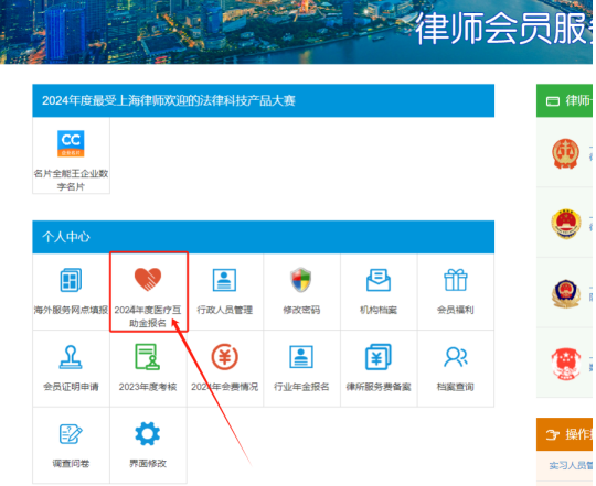 律师事务所登录东方律师网,进入【会员中心】,选择【2024年度医疗互助金报名】,点击进入互助金报名页面。如图所示: