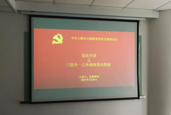 2019年3月29日,上海市光大律师事务所党支部举办党员开讲系列讲座之三法合一之外商投资法简析。邀请光大所管理合伙人沈静律师重点介绍《外商投资法》的立法亮点和条文演化,同时结合自身在涉外法律服务领域丰富经验,从律师角度就负面清单管理制度、国家安全审查制度等问题在实务中具体实施方法进行阐释。