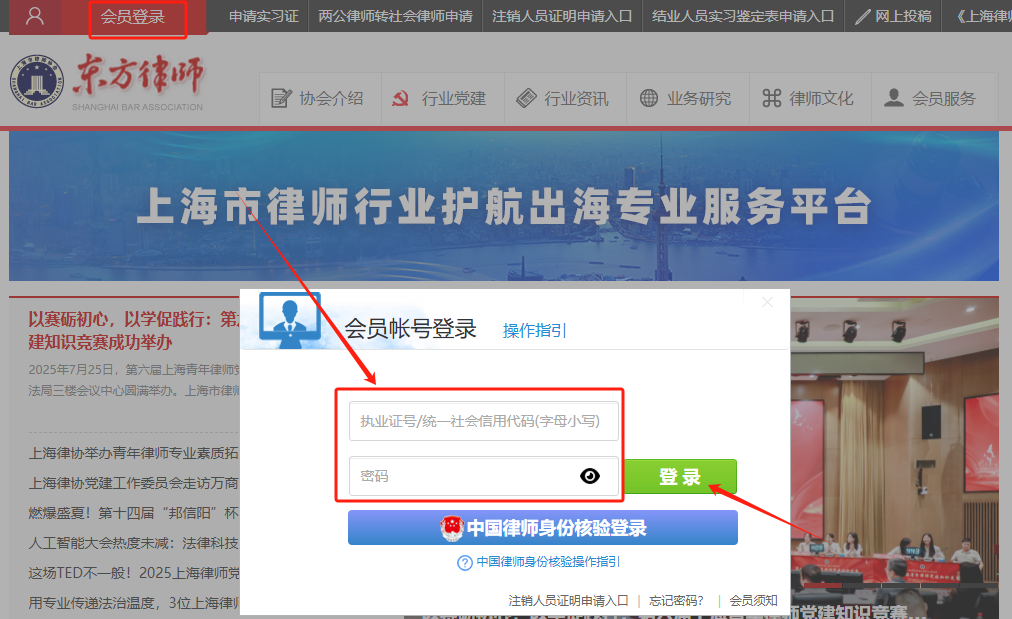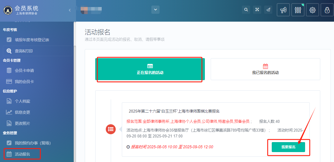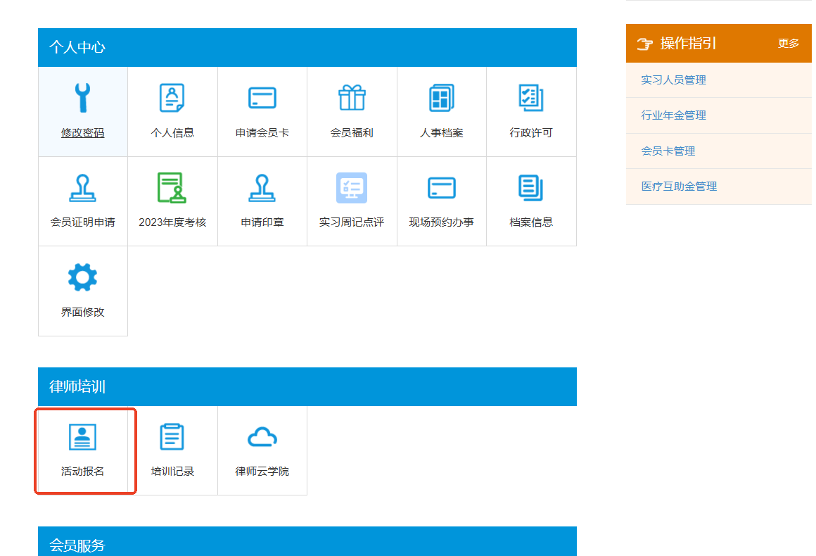方式2:通过“个人会员账号”登录东方律师网,进入“会员中心”,点击“活动报名”,如下图所示:
