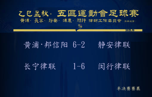 2025年11月5日,2025上海五区律师活力运动汇足球赛迎来半决赛激战。黄浦·邦信阳迎接静安律联,长宁律联迎接闵行律联的挑战。两场比赛大开大合,精彩纷呈,为观众上演了进球大战。