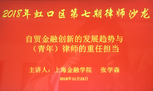 2018年11月23日,由上海市虹口区女律师联谊协会承办的2018年虹口区第七期律师沙龙在虹口公证处法律家园成功举行。本次沙龙特邀上海立信会计金融学院金融法律与政策研究中心主任,上海仲裁委员会/上海金融仲裁院仲裁员、中国贸促会/中国国际商会调解中心调解员、金融专家组成员张学森教授做“自贸金融创新的发展趋势与(青年)律师的责任担当”主题讲座。