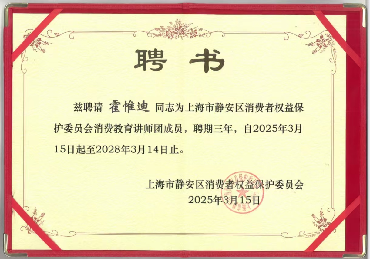 北京市京师(上海)律师事务所霍惟迪律师被聘为静安区消保委消费教育讲师团成员,并积极参加在静安区大悦城举行“3·15”国际消费者权益日现场活动,为市民提供公益咨询服务,从专业视角提出法律建议。