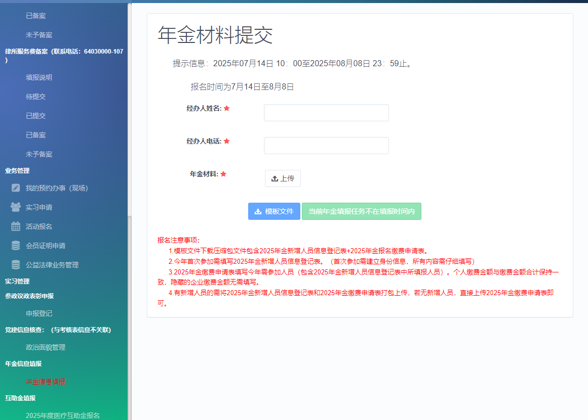 4.有新增人员的事务所需将《2025年金新增人员信息登记表》和《2025年金缴费申请表》压缩打包后上传;所内若无新增人员,直接上传2025年金缴费申请表即可。