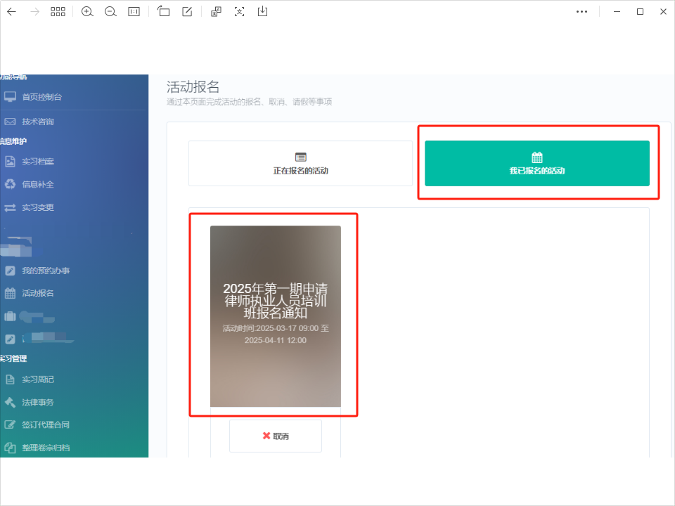 4、点击“已报名活动”,选择“2025年第一期申请律师执业人员培训班”,点击“缴费”;