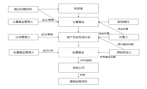 首先以如下图示看一下基础设施REITs的交易结构(虚线私募基金为或有选项):