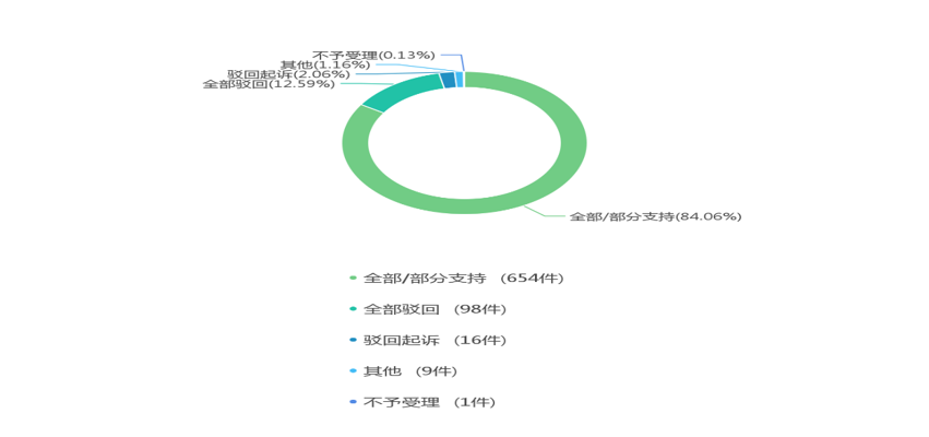 通过对一审裁判结果的可视化分析可以看到,当前条件下全部/部分支持的有654件,占比为84.06%;全部驳回的有98件,占比为12.60%;驳回起诉的有16件,占比为2.06%;其他与不予受理合计10件,占比为1.28%。