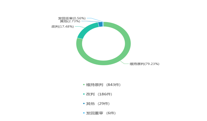 通过对二审裁判结果的可视化分析可以看到,当前条件下维持原判的有843件,占比为79.23%;改判的有186件,占比为17.48%;其他的有29件,占比为2.73%。