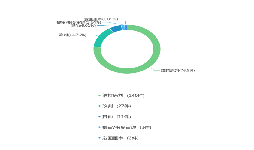 通过对再审裁判结果的可视化分析可以看到,当前条件下维持原判的有140件,占比为76.50%;改判的有27件,占比为14.76%;其他的有11件,占比为6.01%。