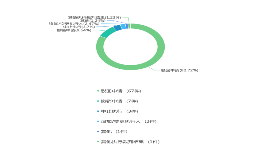 通过对执行裁判结果的可视化分析可以看到,当前条件下驳回申请的有67件,占比为82.72%;撤销申请的有7件,占比为8.64%;中止执行的有3件,占比为3.70%。