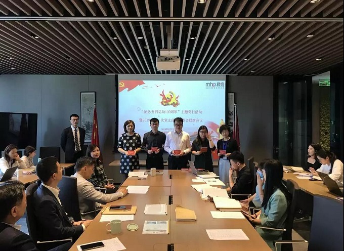联席会议结束后,君悦党支部隆重举行了纪念五四运动100周年主题党日活动,支部副书记朱平晟担任活动主持人。第一项内容为张伟华书记的《微党课》,张书记精心准备了PPT,以“发扬传统、勇于担当、牢记使命——解读如何践行《中国共产党支部工作条例》”为主题,讲了三方面内容:一、发扬五四精神,坚定信念,服务祖国;二、支部条例为准则,制度保障为基础;三、凝心聚力,共创君悦党建新篇章。党员们仔细聆听,不时笔记,学习氛围浓厚。