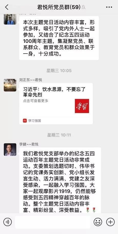 微党课结束后,主持人说,今天是个好日子,农历节气“小满”,“小满”意为“小而盈满”,寓意君悦所“已有成就,期待更大的收获”。君悦党支部一路走来离不开党建之友的支持,今后的成就更离不开大家凝心聚力一起奋斗。借此进入主题党日活动的第二个环节,号召党建之友下载学习强国APP,一起学习进步。胡光主任发表了热情洋溢的讲话,表示前任党支部书记叶书记带领党支部取得了很好的成绩,获得了很高的荣誉,今后会继续大力支持张书记带领下的君悦党支部,大家齐心协力把君悦各项工作推向新高度。之后,胡光主任、刘习赟副主任带领部分非党员律师一起下载学习强国软件,现场学习,把主题活动气氛点燃。