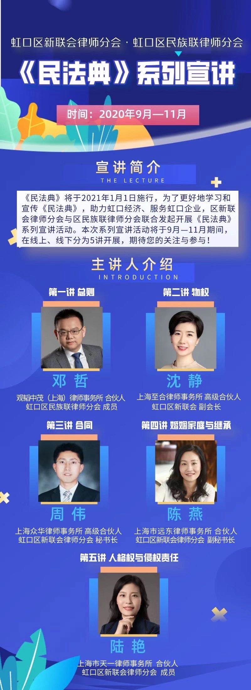 5位主讲律师均为虹口区新联会律师分会及民族联律师分会的会员,也是虹口区相关律师事务所的主任或合伙 人,具有深厚的法律理论功底及丰富的实务经验,本次宣讲活动也将充分展示虹口律师的专业能力和职业风采。