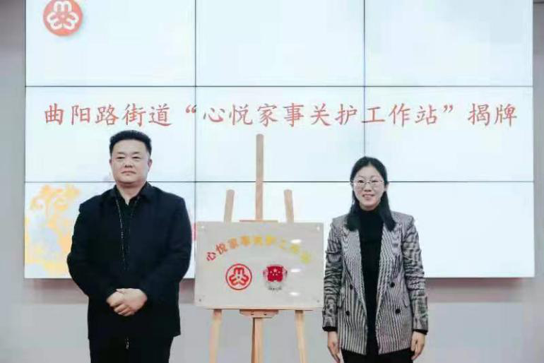 虹口区司法局三级调研员周球、曲阳路街道党工委副书记何东滔为全市首个社区级家事关护站——曲阳街道的“心悦家事关护工作站”揭牌。