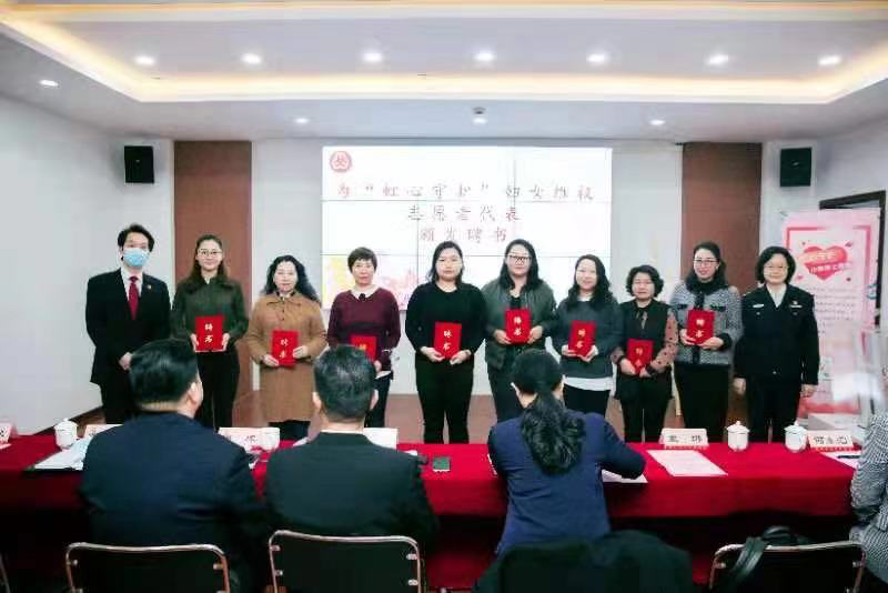 虹口女律联代表上台接受“虹心守护”妇女维权志愿者聘书