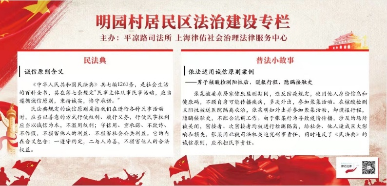 上海四维乐马律师事务所党员律师谢东、田卫民律师为居民制作了疫情防控法治专栏,以《民法典》诚信原则为落脚点,讲述“男子核酸检测阳性后,谎报行程,隐瞒接触史”等普法小故事,深入浅出,达到了提高居民防疫意识和遵守防疫规则的良好效果,为科学防疫、依法抗疫提供法律护航。