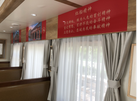 由“周恩来号”机车牵引的“南湖·1921”红色教育主题列车,车体涂装采用红绿配色,一条金黄色腰线贯穿车身,格外鲜艳夺目。车厢的座位上方挂有1921年上海至嘉兴的列车时刻表、1918年的嘉兴地图和南湖全景图、上世纪20年代的南湖烟雨楼老照片、上世纪30年代的南湖游船老照片、门票和摆渡票等等。同志们深刻浸润在红色氛围之中,仿佛回到了百年前的那个开天辟地的日子。
