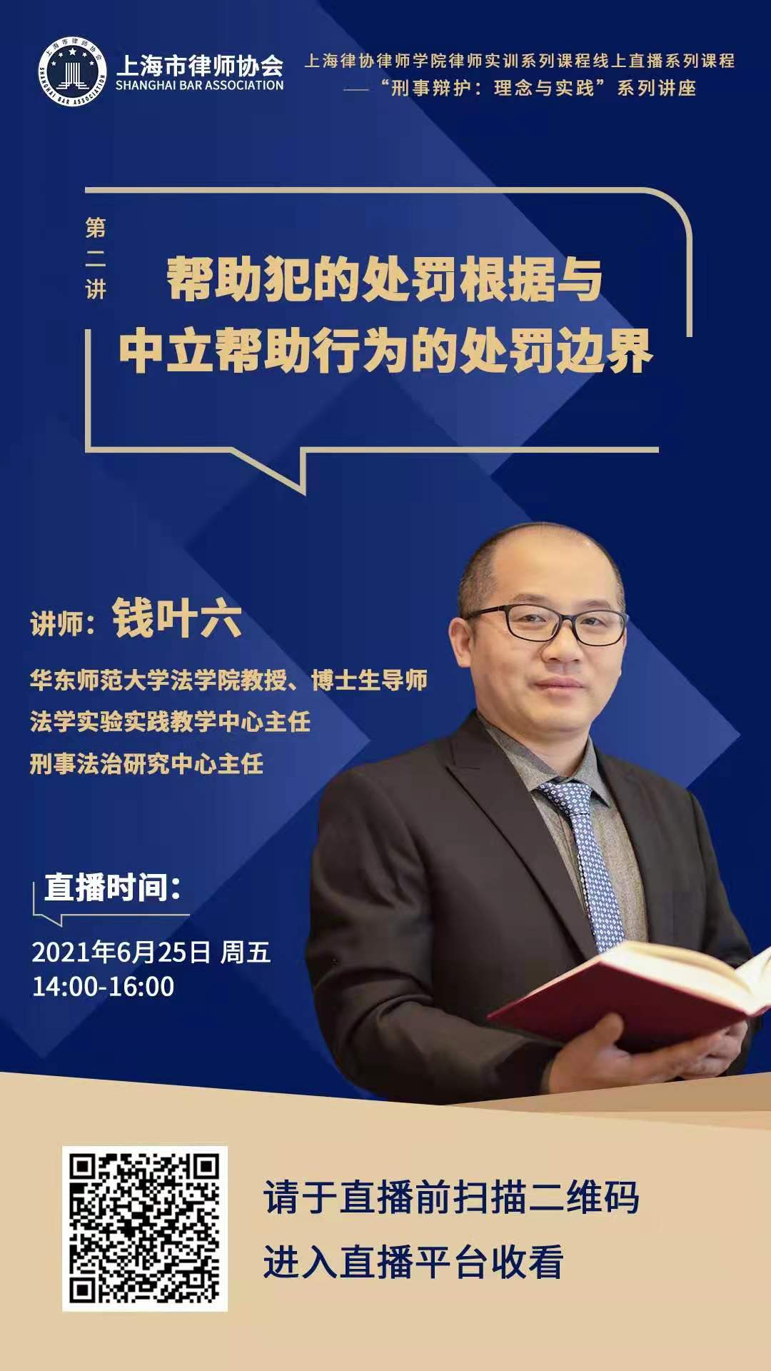 2021年6月25日下午,上海律协律师学院联合刑法与刑事辩护业务研究委员会(以下简称“刑法委”)在律协报告厅共同举办“刑事辩护:理念与实践”系列讲座(第二讲)。本期讲座的主题为“帮助犯的处罚根据与中立帮助行为的处罚边界”,由华东师范大学法学院教授、博士生导师钱叶六教授担任主讲人,刑法委副主任裴长利律师担任主持人,刑法委副主任王恩海教授担任点评嘉宾。线上、线下共计2000余人次参与了本次讲座。