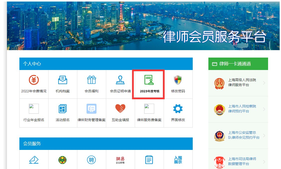 律师事务所通过团体会员账号登录东方律师网“会员中心”(http://www.bulaozaixian.com),进入“2023年度考核”栏目,对本所律师提交的《律师执业年度考核登记表(2023年度)》出具考核意见后,通过系统填写《律师事务所年度检查考核登记表(2023年度)》上报市律协。该栏目将于4月1日正式上线。