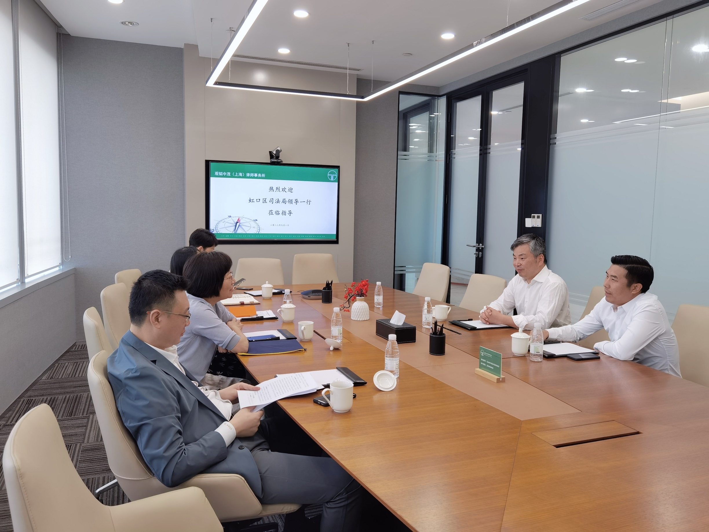 2023年9月1日上午,虹口区司法局副局长、区律师行业党委书记胡晓红和虹口律工委主任、区律师行业党委副书记田波等一行,前往北京观韬中茂(上海)律师事务所(以下简称“观韬中茂所”),对参加2022年度“援藏律师服务团”活动的青年律师志愿者殷林彦律师进行慰问并送上慰问金。观韬中茂所高级合伙人、律所党委副书记狄青出席。