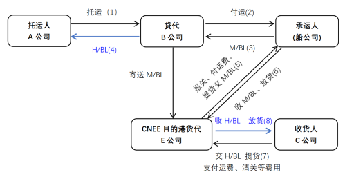 此种情况下,船公司将提单副本传给货代填写信息,提单上的托运人填货代名,收货人填货代在目的港的代理;货代在确认后,提出电放申请;承运人同意的,将电放信或者电放号传给货代;最后由货代在目的港的代理人从承运人目的港代理中提货。另一方面,货代公司签发正本的货代提单给托运人,提单上的托运人填托运人的名称,收货人填目的港收货人的名称,目的港的收货人凭该提单的正本在目的港,从货代公司代理手中提货。