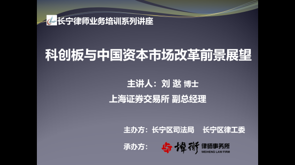 为进一步提升长宁区律师办理科创板及资本巿场业务能力,2019年11月22日下午,由长宁区司法局、长宁律工委主办、北京炜衡(上海)律师事务所承办,特邀上海证券交易所副总经理、国务院参事室金融研究中心研究员刘逖博士,开展了关于“科创板与中国资本市场改革前景展望”的专题讲座。