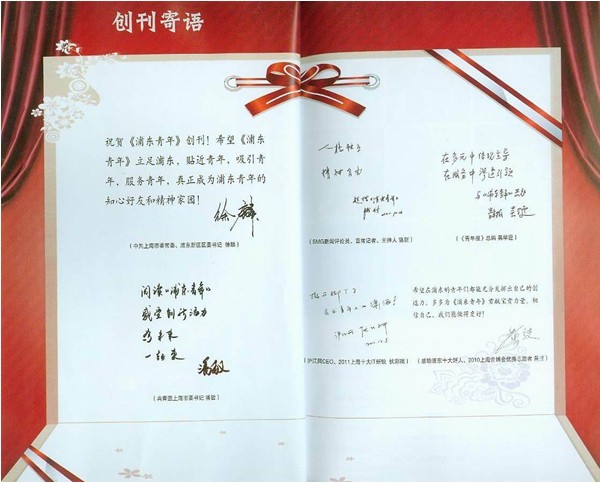 下图为《浦东青年》杂志的创刊号封面,和中共上海市委常委、浦东新区区委书记徐麟、共青团上海市委书记潘敏等领导同志为杂志题写的创刊寄语。