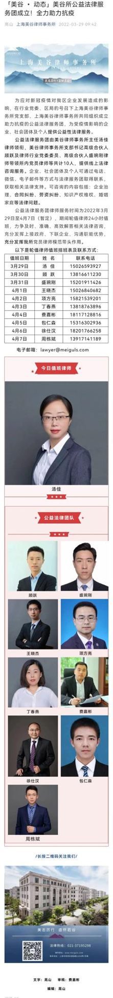上海美谷律师事务所主任 汤佳律师 带领本律所律师组成公益法律服务团24小时值班。